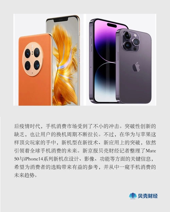 后疫情时代,手机消费市场受到了不小的冲击。突破性创新的缺乏,也让用户的换机周期不断拉长。不过,在华为与苹果这样顶尖玩家的手中,新机型在新技术、新应用上的突破,依然引领着全球手机消费的未来。新京报贝壳财经记者整理了Mate 50与iPhone14系列新机在设计、影像、功能等方面的关键信息,希望为消费者的选购带来有益的参考,并从中一窥手机消费的未来趋势。