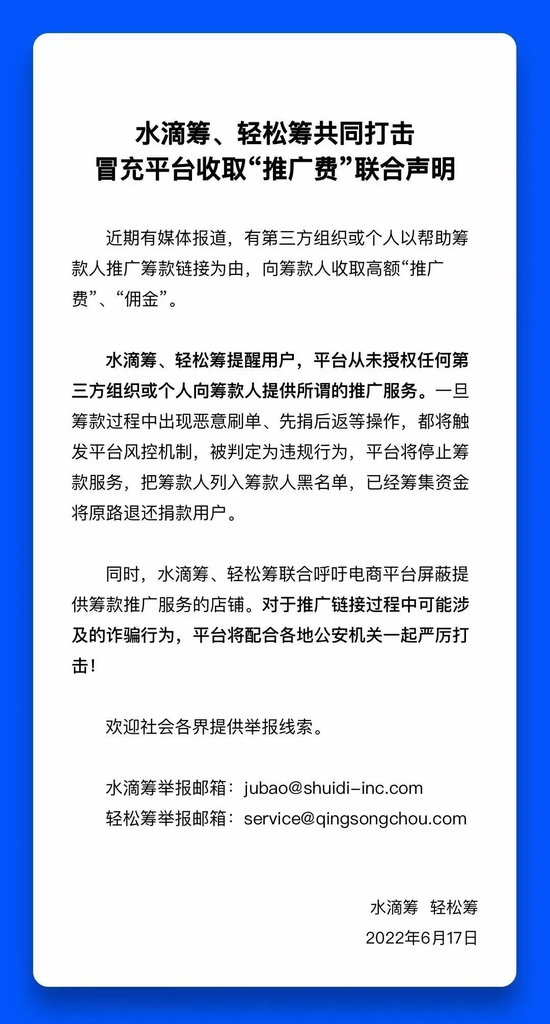 前段时间,关于“筹款中介向筹款病人收取推广费,最高抽成达70%”的消息成为舆论焦点。对此,水滴筹、轻松筹发布《共同打击冒充平台收取“推广费”联合声明》,强调平台从未授权任何第三方组织或个人向筹款人提供所谓的推广服务。