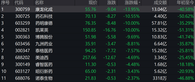 A股个股方面,百亿巨头康龙化成(300759)领跌13.95%,药石科技(300725)跌10.55%,凯莱英(002821)、千亿巨头药明康德(603259)10%跌停,博腾股份(300363)跌9.69%,九洲药业(603456)、泰格医药(300347)跌逾7%,睿智医药(300149)、昭衍新药(603127)等跌逾3%。