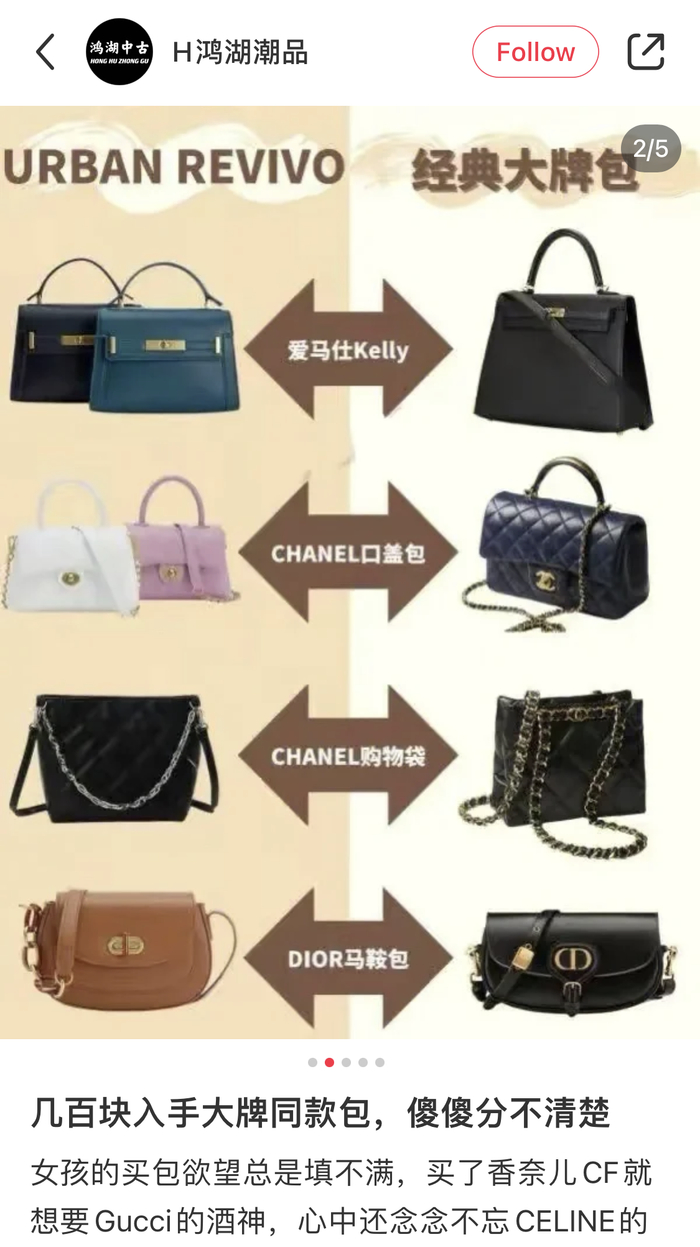 在微博和小红书等社交媒体上,以“UR大牌”作为关键词进行搜索,可以发现多款手袋和香奈儿、葆蝶家以及圣罗兰等品牌产品的廓形、颜色和细节相仿。