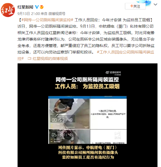 【#网传一公司厕所隔间装监控# 工作人员回应:今年才安装 为监控员工吸烟】近日,网传一公司厕所隔间装监控。9月13日,中航锂电(厦门)科技有限公司相关工作人员回应红星新闻记者称:今年才安装,为监控员工吸烟。对此河南豫龙律师事务所付建律师认为,公司在厕所非公共区域安装摄像头,无论是出于安全考虑,还是方便管理,都严重侵犯了员工的隐私权。员工可以要求公司拆除监控设备,还可以向劳动监察部门举报和投诉。