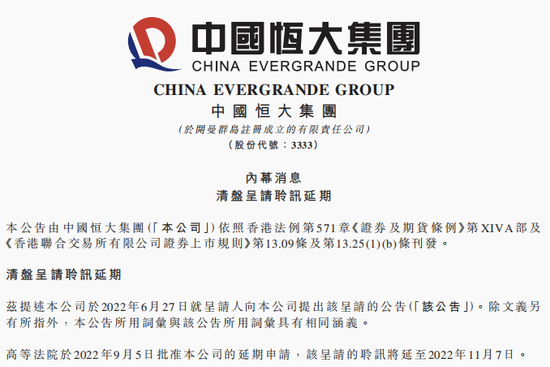 9月5日,中国恒大发布内幕消息称,香港高等法院已经批准了公司的延期申请,清盘呈请聆讯将延至2022年11月7日。