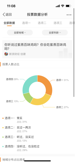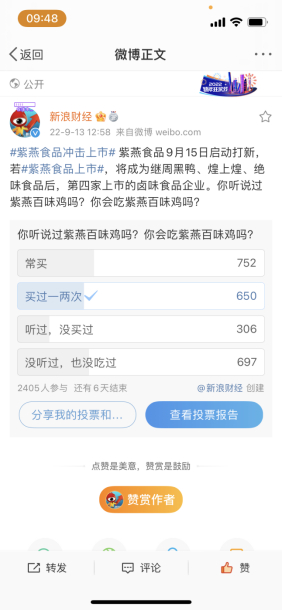 一项由新浪财经发起的、2400余人参与的投票表示,有31%,752人常买紫燕百味鸡;31%,50人买过几次紫燕百味鸡;“听过,没买过”和“没听过也没吃过”的人分别占比为13%和29%。
