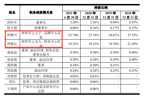 招股书显示,紫燕食品的实际控制人为钟怀军、邓惠玲、钟勤沁、戈吴超、钟勤川5人,分别持有紫燕食品20.77%、15.90%、19.33%、6.23%、23.74%的股权,5人合计持有公司85.98%股份并控制公司88.58%的表决权。