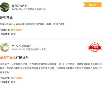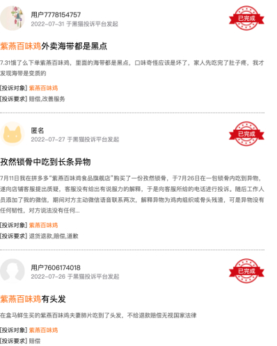 黑猫投诉上也有不少消费者表示,在其夫妻肺片中吃到了苍蝇、红肠掉色、海带上有黑点、锁骨中吃到长条异物、产品中有头发等等。