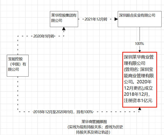 资料显示,2018年12月成立的深圳莱华商业管理有限公司(原名“深圳宝能商业管理有限公司”,下称“莱华商管”),原本由宝能控股(中国)有限公司100%持有,2020年9月转让给莱华控股后,随着莱华控股大部分股权转移到姚建辉名下,也成了姚建辉名下的资产。