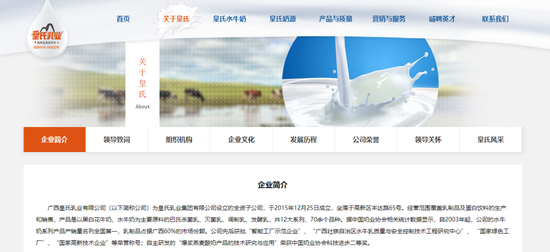 官网显示,广西皇氏乳业有限公司为皇氏乳业集团有限公司设立的全资子公司,于2015年12月25日成立,经营范围覆盖乳制品及蛋白饮料的生产和销售,产品是以黑白花牛奶、水牛奶为主要原料的巴氏杀菌乳、灭菌乳、调制乳、发酵乳。