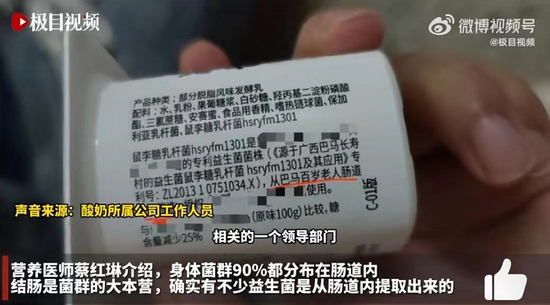 “鼠李糖乳杆菌hsryfm1301是从巴马百岁老人肠道采集筛选……”近日,有网友在社交平台发布视频称,一款酸奶的配料表页面显示,其添加的一款益生菌菌株,是从广西巴马百岁老人肠道采集筛选的。