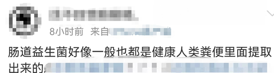 对此,不少网友认为该宣传表述过于直白,令人不适。有人吐槽称,“突然就变味了,这阵子不想喝酸奶了”“看到这种配料表,就没食欲了。”还有人科普表示,肠道益生菌一般都是健康人类粪便提取出来的。