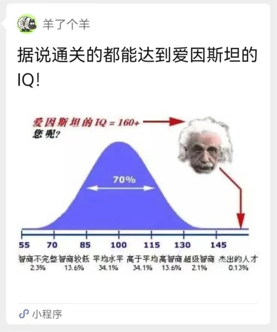 另一类则在文案和视频标题上下功夫。这类投放多在微信平台,比如将游戏和智商挂钩——“据说通关都能达到爱因斯坦的IQ”;比如使用“史上最难”“通关率不到0.1%”勾起用户的胜负心。