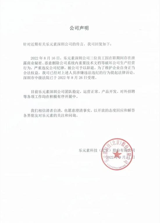9 月17日,乐元素科技针对近期有关乐元素深圳公司的传言相关事宜发布声明。