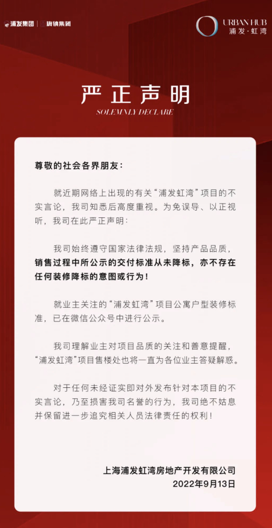 记者注意到,浦发虹湾业主在小红书平台发表了多篇图文之后,浦发虹湾官方微信公众号9月13日发布了一份《严正声明》,声明称:“就近期网络上出现的有关浦发虹湾项目的不是言论,未免误导、以正视听,特此严正声明,销售过程中所公示的交付标准从未降标,亦不存在任何降标的意图和行为。”