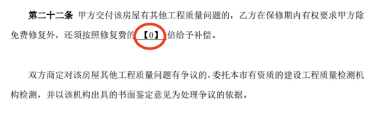 “甲方交付该房屋有其他工程质量问题的,乙方在保修期内有权要求甲方除免费修复外,还须按照修复费的【0】倍给予补偿。”