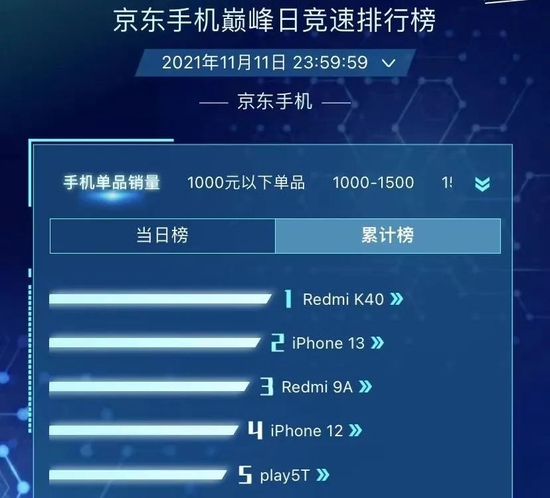 京东双十一期间,红米K40(2000—3000元)累计销量第一,iPhone 13(5000—10000元)第二,红米9A(1000元以下)第三,iPhone12(5000—10000元)第四。
