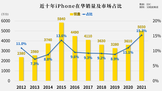 根据IDC的数据,2021年,苹果手机在华销量,时隔六年重新攀上5000万台大关,市场占比创下新高,称为“重回巅峰”亦不为过。