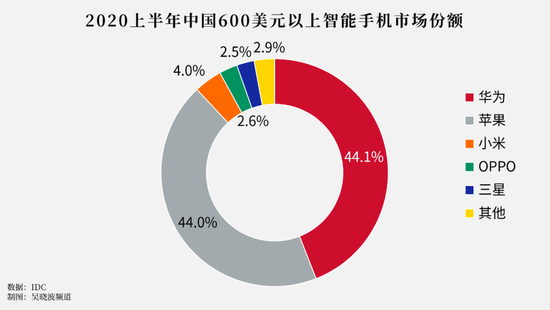 2020年上半年,600美元以上的国内高端手机市场,华为拿下了44.1%的份额,以毫厘之差胜过苹果。二者合计超过88%,几乎非此即彼。