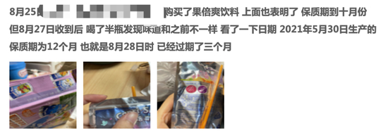 例如,在黑猫投诉平台上,一消费者表示,“2022年8月25日在电商平台上购买了果倍爽饮料,销售页面也表明了保质期到今年十月份。不过,消费者在8月27日收到产品品尝后便发现味道和之前不一样。消费者在查看日期后发现,该产品是2021年5月30日生产的,按照12个月保质期来算已经过期了三个月。”