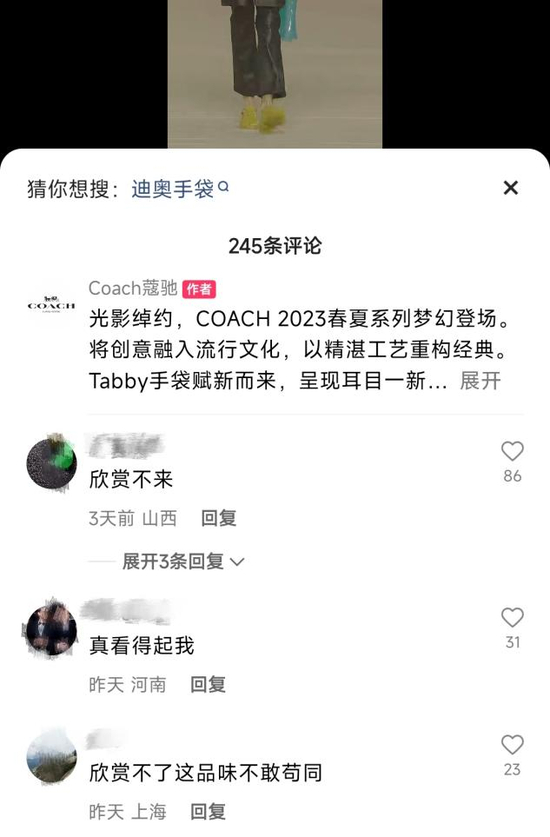 比如,在轻奢品牌Coach的快手官方账号,有网友在视频下方留言:“欣赏不了这品味,不敢苟同。”还有网友评论道:“这是谁设计的,我们村荷花比他强啊。”