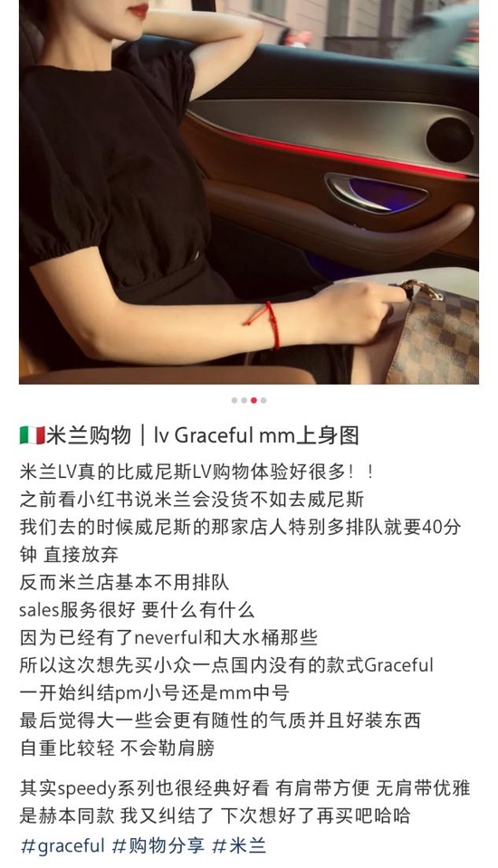 有的小红书博主,分享自己在米兰LV的购物体验,表示在米兰LV店,要先买国内没有的款式Graceful,并认为Speedy系列也很经典、很好看,无肩带优雅、是赫本同款。