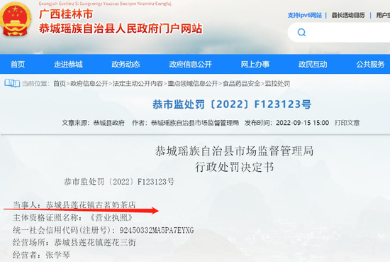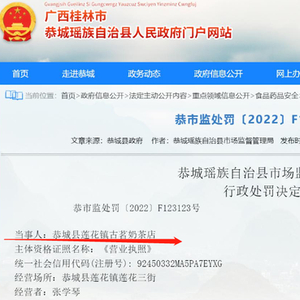 据企查查APP显示,近日, 广西壮族自治区桂林市恭城瑶族自治县莲花镇古茗奶茶店因使用超过保质期的原料加工食品,被恭城县市场监督管理局罚款2000元。