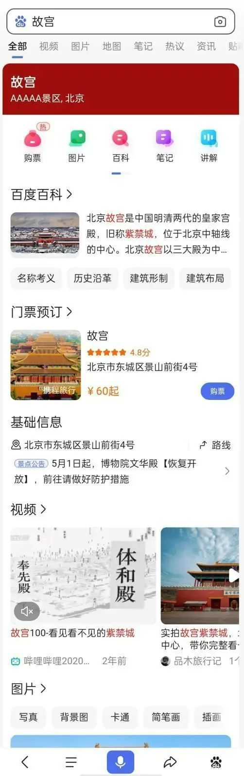 什么意思呢?她举了这样一个例子:比如用户在百度 App 搜索“故宫”,结果页不再是传统的图文信息,而是购票、视频、游记等综合服务。用户可以通过视频和讲解去了解故宫的知识,随即产生游览需求,而通过智能小程序即可直接购票,完成线下游玩。