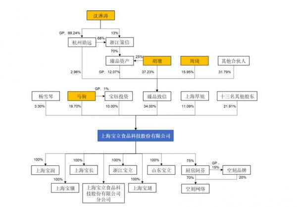 值得注意的是,上述一系列操作中的关键人物沈淋涛同时又是宝立食品的实际控制人之一。马驹、胡珊、周琦、沈淋涛是宝立食品的共同实际控制人,合计控制公司 67%的股份表决权。再进一步,通过天眼查的股权穿透图,宝立食品的疑似实际控制人是沈淋涛。