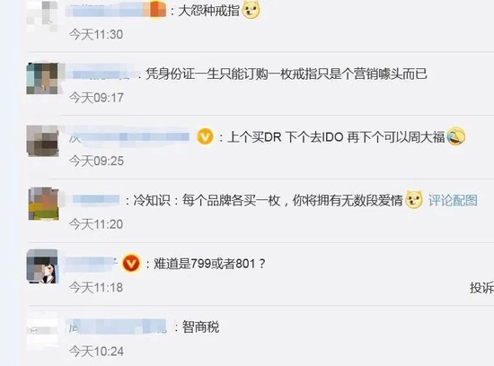 还有网友质疑“凭身份证一生只能订购一枚戒指只是个营销噱头而已”“成本4000卖15000,不一起回应一下吗?”