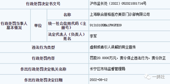 2022年8月12日,上海市市场监督管理局发布行政处罚决定书(沪市监长处〔2022〕052021001714号),上海联合丽格医疗美容门诊部有限公司存在以下违法行为:虚假或者引人误解的商业宣传。长宁区市场监督管理局决定对其处以罚款20万元,责令停止违法行为,责令改正。