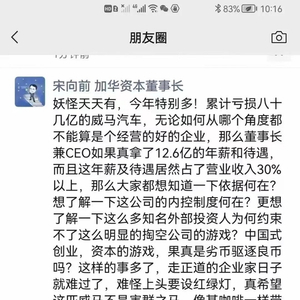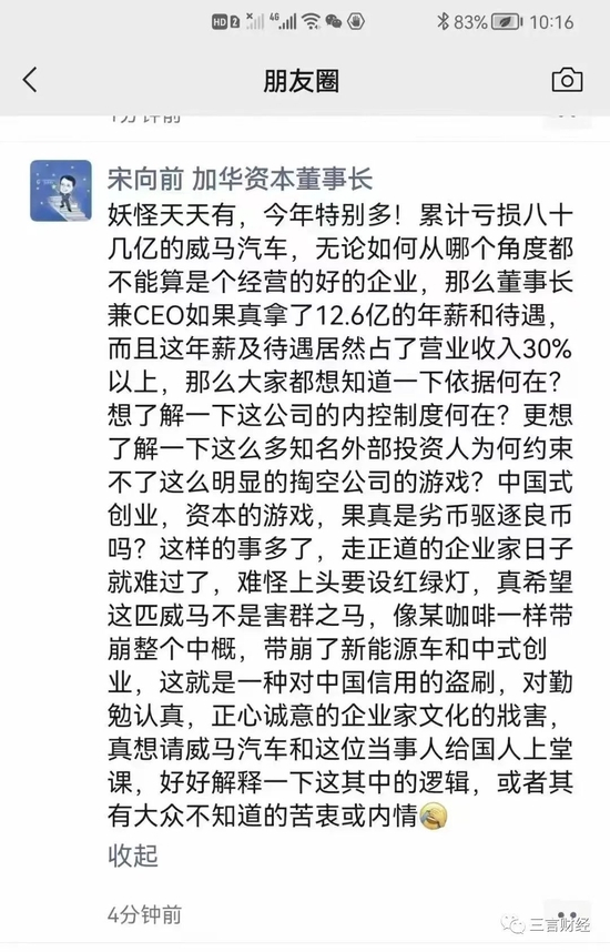 今日,加华资本董事长宋向前发文怒斥威马汽车累计亏损超过八十多亿,竟然公司董事长兼CEO拿了12.6亿元的天价年薪待遇,并且其个人收入占了公司营收的30%以上。