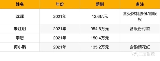 2021年,威马沈晖年薪12.6亿元;零跑朱江明954.6万元;李想150.4万元;何小鹏135.2万元。