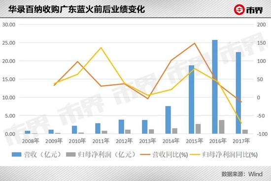 蜜月期的3年里,广东蓝火制作出《跨界歌王》《旋风孝子》《女神的新衣》等高收视率综艺节目,累计实现7.65亿元净利润,带动华录百纳营收从2013年3.78亿元增至2016年25.75亿元,净利润从1.25亿元增至3.85亿元,市值一举超过500亿元。