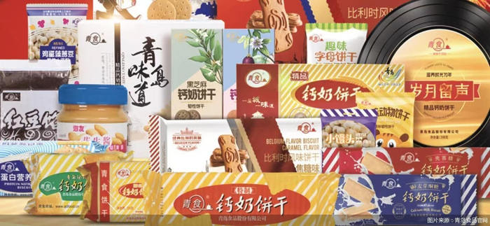 官网资料显示,青岛食品始创于1950年,主营饼干、花生酱等休闲食品,是“钙奶饼干第一股”,1960年推出了核心单品“青食”钙奶饼干。