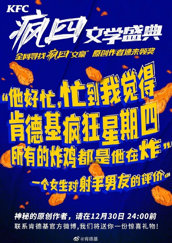 与时俱进的肯德基在去年2021年12月30日“疯四文学”翻红初期,还亲自下场,开了一场“肯德基疯四文学盛典”直播。