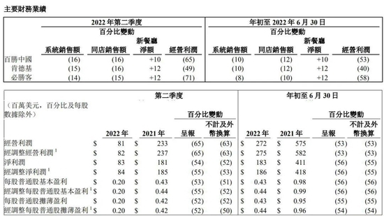 2022年第二季度百胜中国相关财报数据