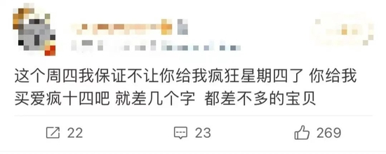 星期四,一个特殊的打工时间节点,加上还是以周为单位的周期循环,更加提高了其输出的频率,让“疯狂星期四”成为了一次又一次疯狂的现象级传播事件。