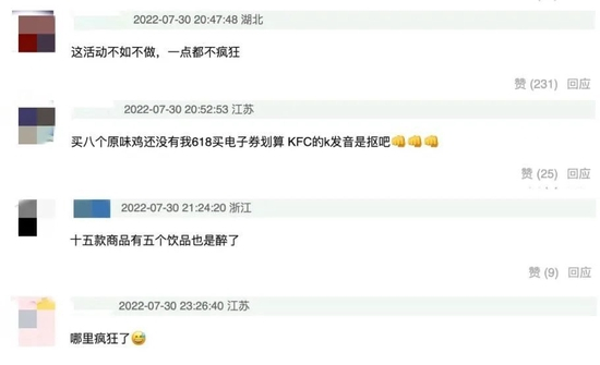 但事与愿违,事实上,随着活动时间拉长,相比活动初期广受好评的菜品,肯德基呈现出了越来越敷衍的趋势。这也解释了为什么有食客对肯德基“疯狂”的定义产生质疑:“疯不起就别疯了,半疯不疯的很烦人。”