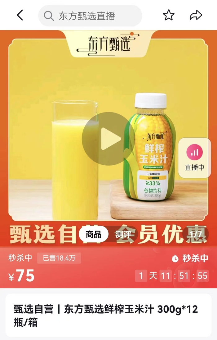 每经编辑搜索抖音平台的东方甄选企业店,以及天猫平台的东方甄选旗舰店,发现目前只有一款鲜榨玉米汁在售。