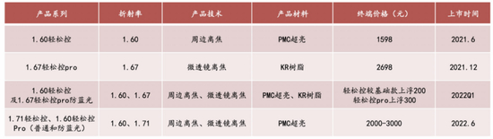 此外,明月镜片离焦镜的产品线较丰富,2022年6月追加4款新品后,目前已具备8款离焦镜产品。其中,“轻松控”镜片采用了周边离焦眼轴控制技术,“轻松控pro”则使用多点近视离焦眼轴控制技术,并具有1.60/1.67/1.71三种不同折射率及防蓝光功能。