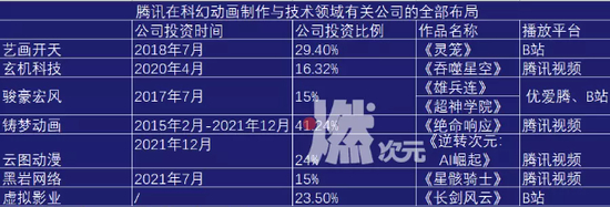 以腾讯视频为例,据燃次元不完全统计,截至今年上半年,腾讯总共投资了7家与科幻动画相关的公司,包括《灵笼》背后的艺画开天、《吞噬星空》背后的玄机科技、《雄兵连》背后的骏豪宏风,以及《星骸骑士》背后的黑岩网络等。而腾讯对这些公司的投资时间,集中在2017年至今的5年里。