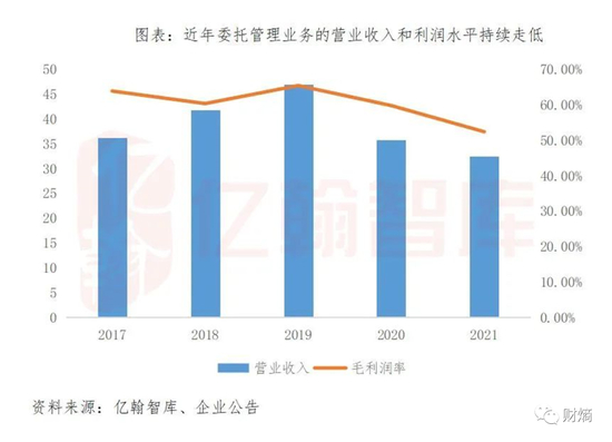 当然,这不排除是红星美凯龙为了轻资产转型,对于委管商场的客单价有所让步;但也可能和委管商场的经营水平不佳有关——一个值得警惕的信号是,委管业务的毛利在逐年降低。此前也有商户质疑委管商场是“后娘养的”,吐槽搭建的委管团队仅能提供基本维护,很难按照美凯龙直营店的标准去运营。