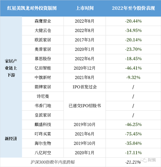 在多元化布局方面,车建新和张近东很像。公开资料显示,红星美凯龙的母公司红星控股,累计对外投资了上百家公司。除了家居卖场及地产外,还涉及房产中介、社区媒体、自动驾驶公司、生鲜平台等多个领域。经财熵粗略整理,这些公司中有11家已经成功IPO,但它们2022年以来的股价表现都相当一般。