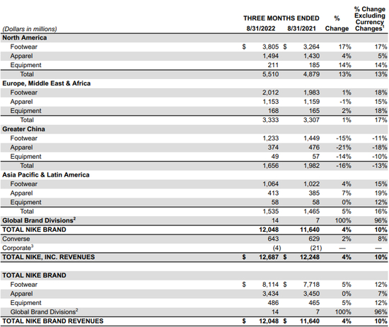 按地区分,Nike品牌在亚洲和拉丁美洲营收增长5%至15.35亿美元,北美增长13%至55.1亿美元,欧洲、中东和非洲增长1%在33.33亿美元。Nike中国营收大跌16%至16.56亿美元约合117亿元人民币,连续第四个季度录得下滑