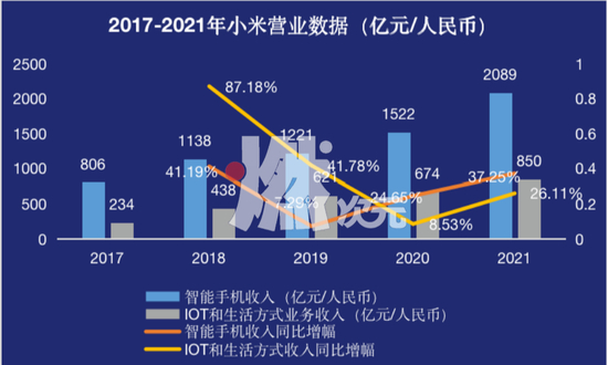数据显示,小米IoT和生活方式业务收入在2020年同比仅增8.53%。尽管到了2021年,这一数字提升至26.11%,但较2019年和2018年依旧有很大差距。