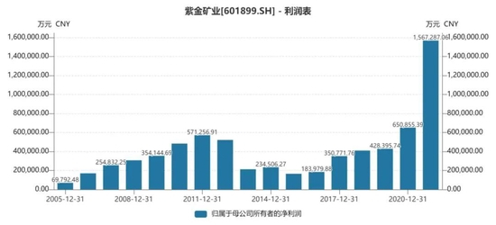 其中,2021年,紫金矿业表现更加生猛,净利润直接翻倍,创下历史新高。