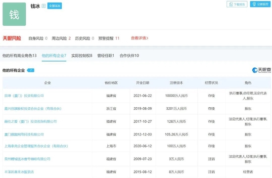 根据天眼查,钱冰名下共有7家公司,领域包括咖啡公司(已注销)、服装店(已注销)、网络公司和辅助生殖机构等。唯一与金融沾边的投资公司,还是结婚大半年后成立的。