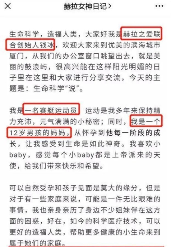 甚至网络流传,钱冰在2017年冻卵22颗。她在赫拉之爱的官微上表示,自己还是一名赛艇运动员,有个12岁的儿子。
