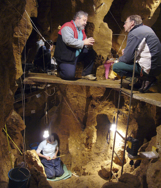 斯万特·帕博(右)亲临西班牙洞穴考古现场和工作人员一起挖掘人类化石