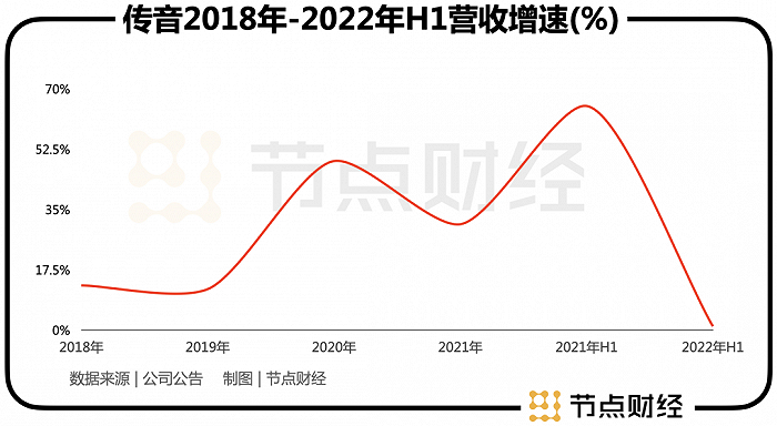 反馈到传音身上的体现则是,公司的营收增速从2020年的49.08%下降至2021年的30.74%,是近五年中下滑幅度最大的,今年上半年的营收增速只有1.11%,增长疲软。而在2021年之前,公司的营收增速总体上呈现上升的趋势。