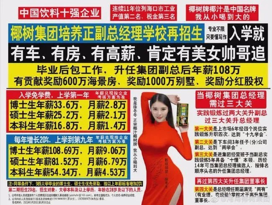 先来看2021年这次。2021年3月25日,椰树集团在其官方微博上发布“椰树集团培养正、副总经理学校再招生!!!专业不限只要懂写作,入学就有车、有房、有高薪、肯定有美女帅哥追。”等内容的招聘广告。当时周刊曾以《又惹争议!土潮椰树还能“神”多久?》为题对此进行过报道。