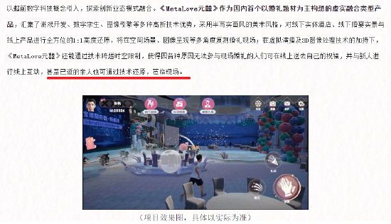 时代财经注意到,中青宝在官网上对于《MetaLove元囍》的描述可谓是“无所不能”,既可以“在空间场景、图像呈现等多角度复刻婚礼现场”,还能“通过技术跨越时空限制,使得因各种原因无法参与现场婚礼的人们可在线上送去自己的祝福,并与新人进行线上互动”,甚至“已逝的亲人也可通过技术还原,莅临现场”。
